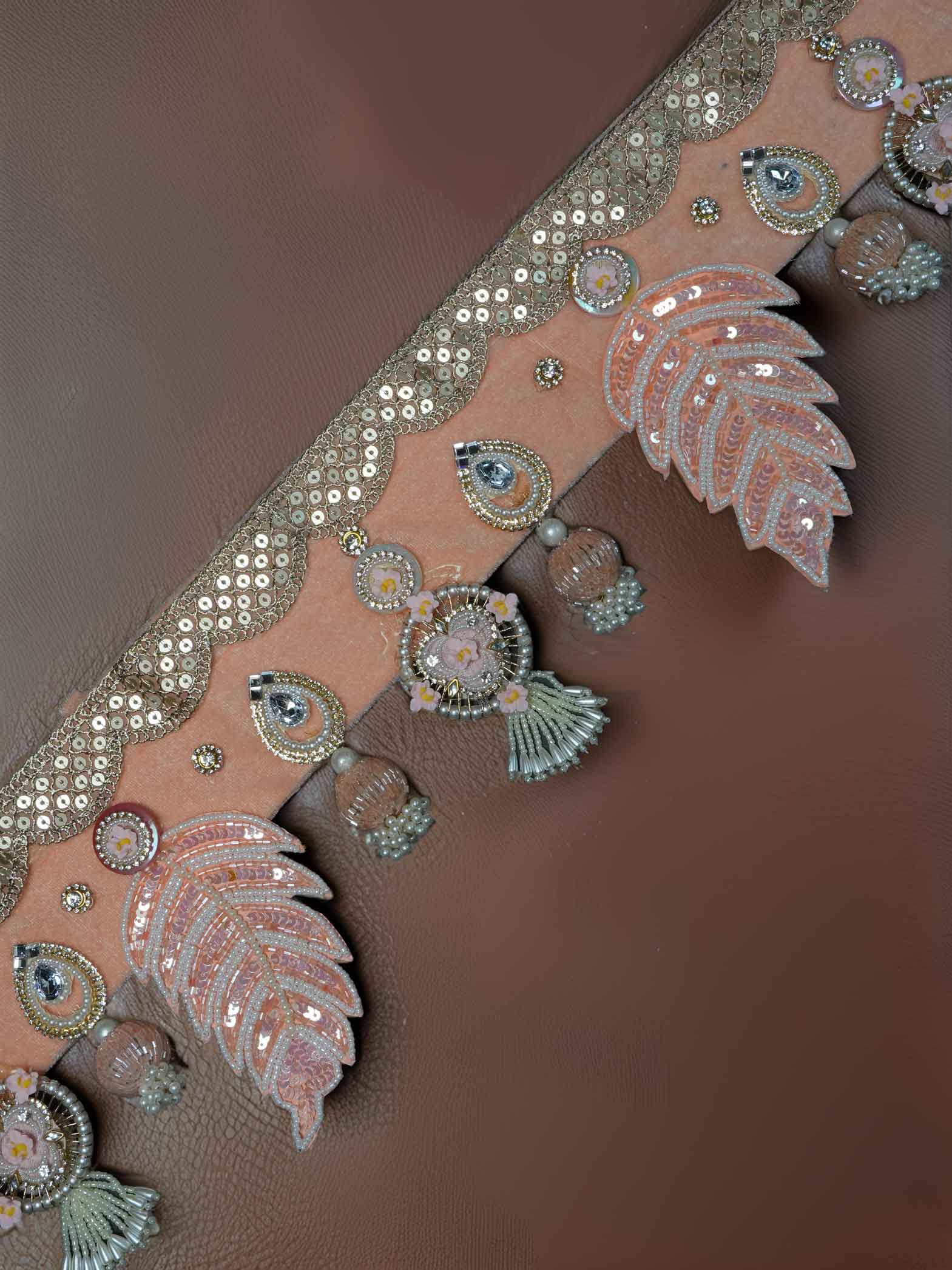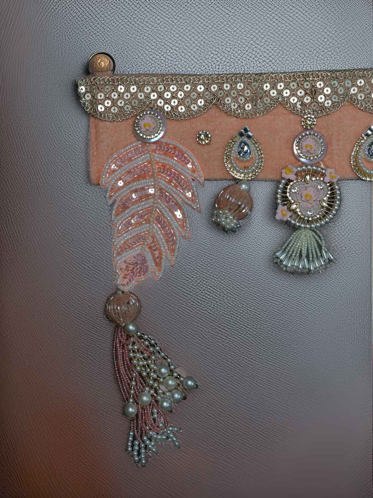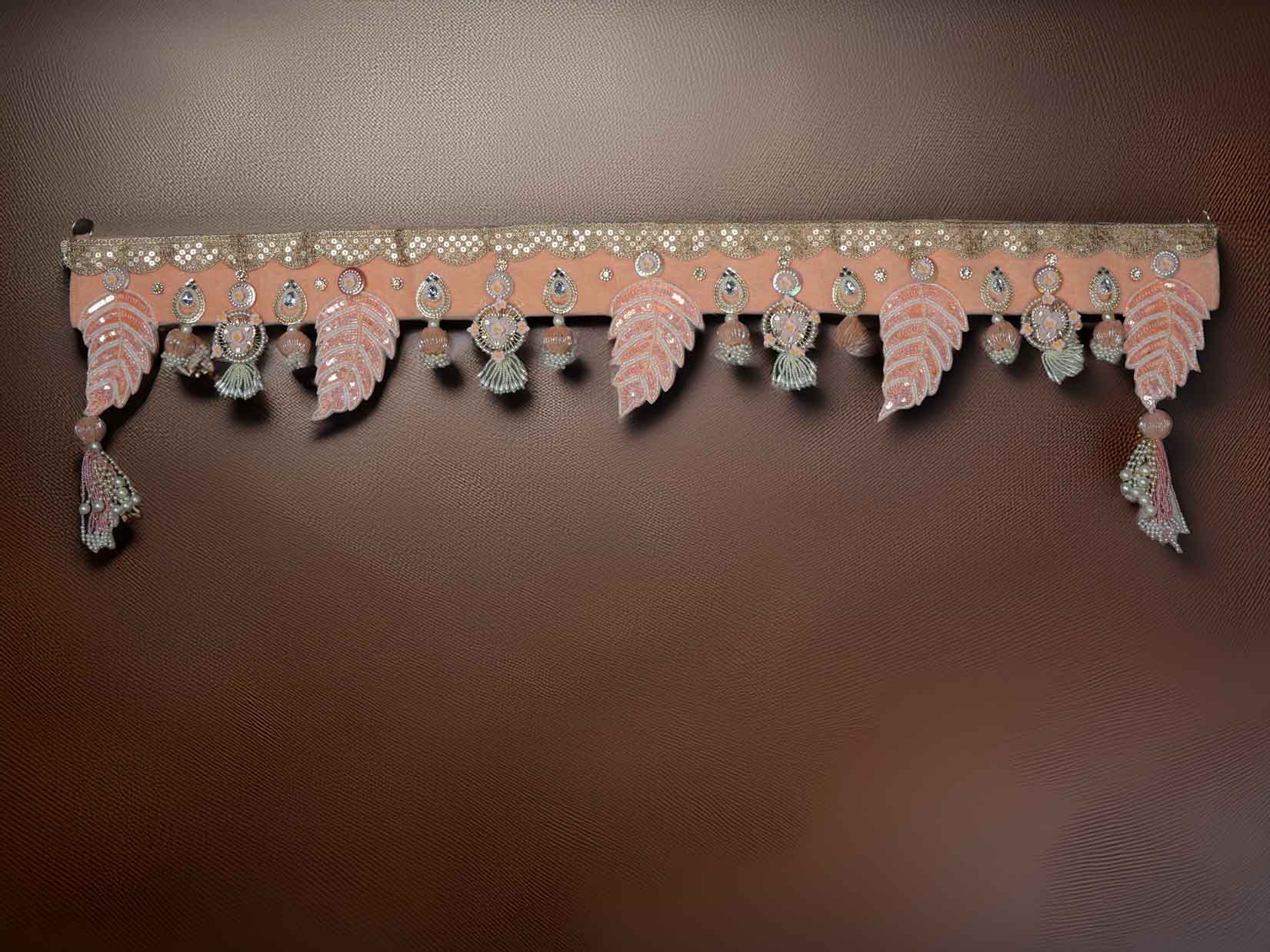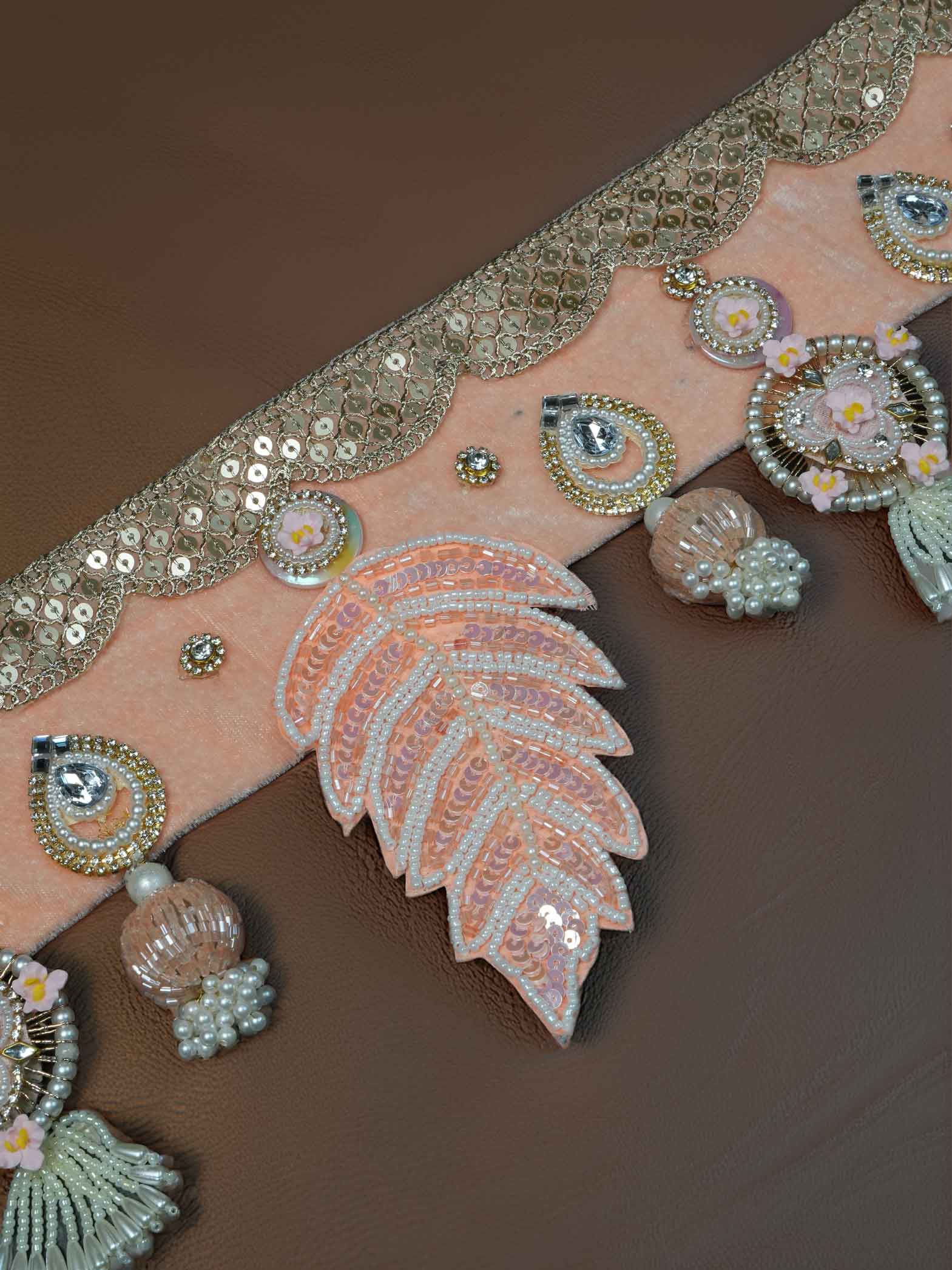 The Madhurima Toran is a graceful pastel-orange creation designed to bring serenity, sweetness, and auspiciousness to your home mandir or doorway. Crafted with intricate pearl hangings, sequin embroidery, and floral motifs, this toran radiates a gentle festive glow, symbolizing peace and devotion.
