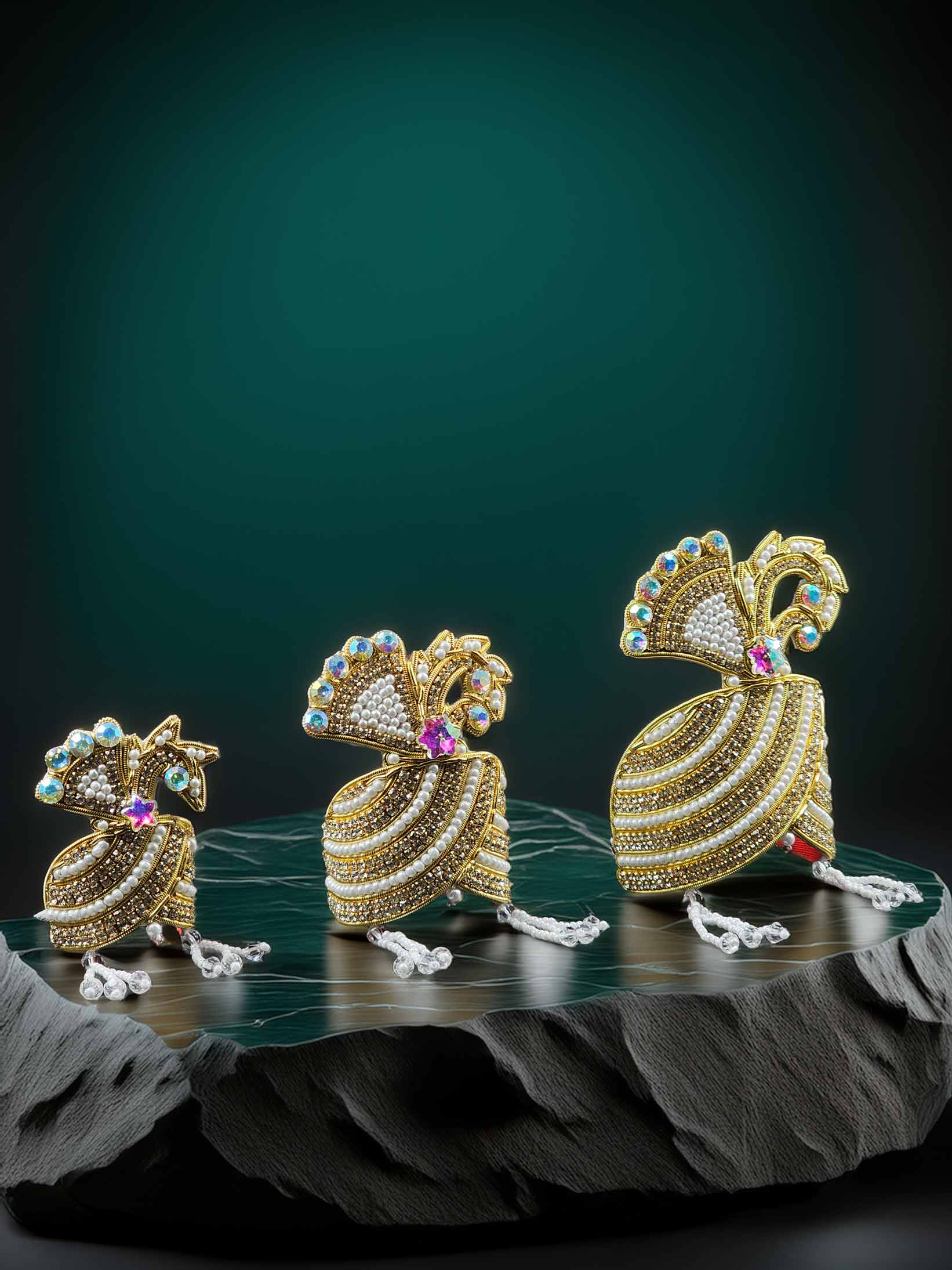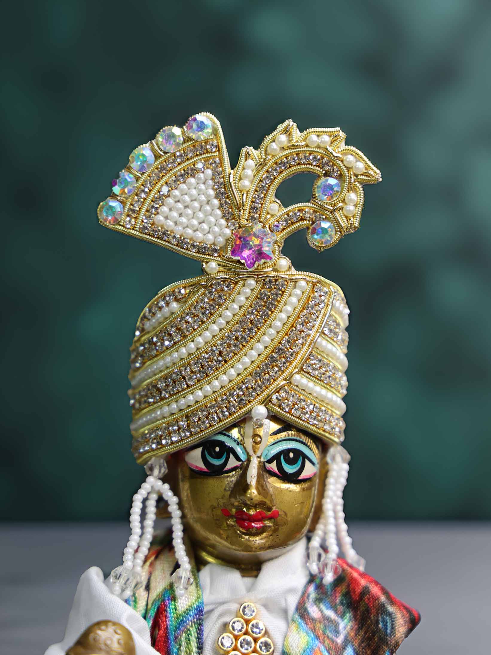 The Eternal Grace Mukut is a beautifully handcrafted crown designed to enhance the divine radiance of your beloved Laddu Gopal Ji. Adorned with sparkling stones and intricate detailing, this mukut reflects Mathura's rich heritage and craftsmanship. Ideal for daily shringar or festive celebrations, it perfectly complements Thakurji’s divine beauty, bringing elegance, devotion, and an aura of timeless grace to your Kanh