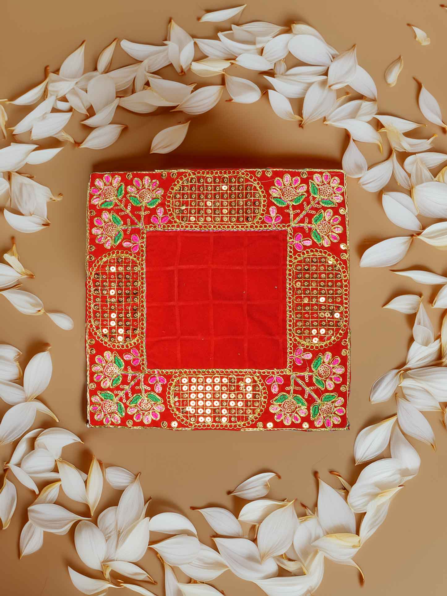 The Pushpanjali Red Aasan is a vibrant velvet base designed for the royal seva of Laddu Gopal Ji and Kanha Ji. Decorated with golden embroidery and colorful floral patterns, it adds a divine charm to your temple setup. The rich red tone represents devotion and auspicious energy, making it perfect for daily pooja, bhajan, or festive darshan.