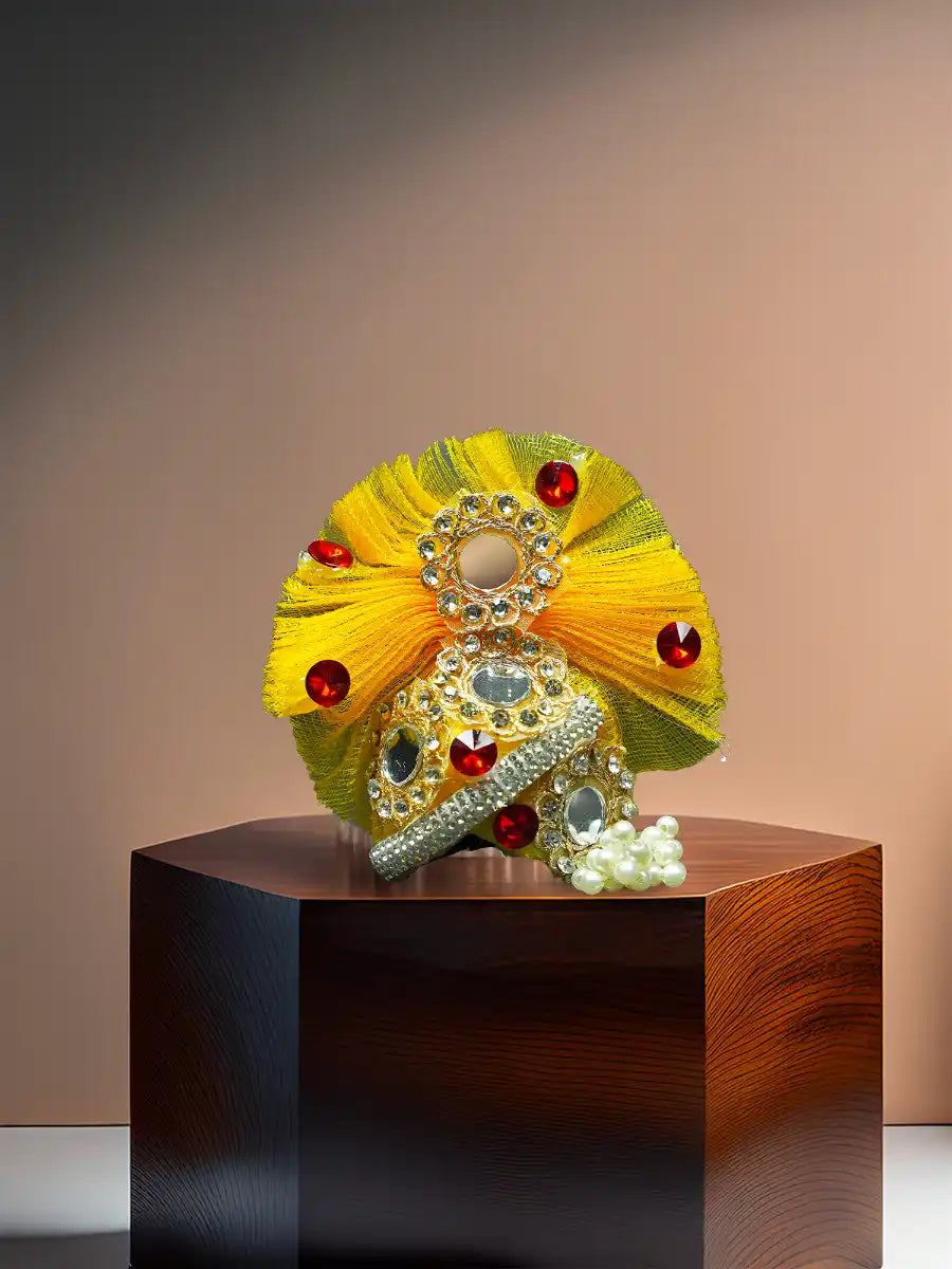 The Suryakant Rajvilas Poshak Dress radiates divine brilliance, crafted in rich yellow tones symbolizing purity and light. Adorned with shimmering stones, pearls, and intricate red highlights, this grand poshak reflects the glow of Diwali diyas and the warmth of devotion.