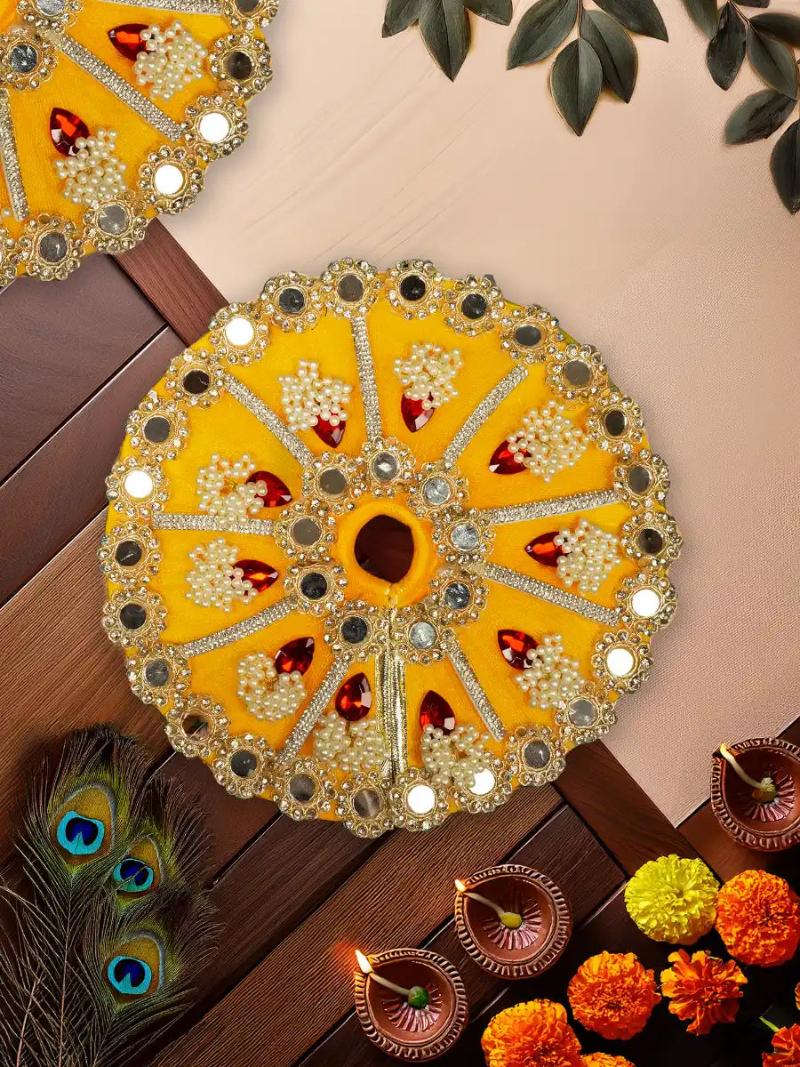 The circular base is complemented by a matching choli, patka, and mukut, giving Laddu Gopal Ji a royal festive appearance. Perfect for Deepotsav, Janmashtami, or special darshans, it adds celestial grace to Kanha Ji’s divine form. Made in Mathura, each detail embodies devotion, tradition, and the eternal glory of Thakur Ji’s Braj Bhumi, making this dress a true symbol of seva and splendor.